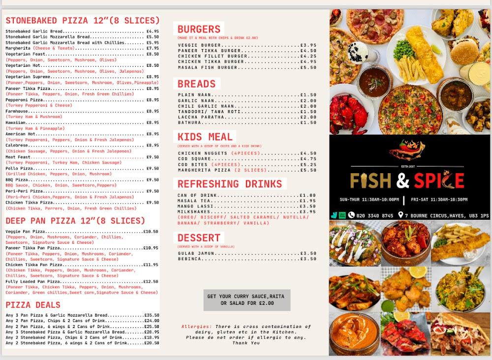 Nestled at 7 Bourne Circus in Hayes, Fish & Spice is a culinary gem that thrives on community spirit and gastronomic diversity. This bustling takeout restaurant embraces a casual atmosphere, perfect for a quick bite or a family dinner. The location benefits from free street parking, making it easy for locals to pop in for their favorite meals. Known for its Halal offerings and quick service, Fish & Spice provides options for those dining solo or with family. With generous portions and varied menu options, it draws diners in for both classic and contemporary dishes, creating a community hub for friends and families. Whether you're craving Indian flavors or a classic fish and chip experience, this place feels like home.